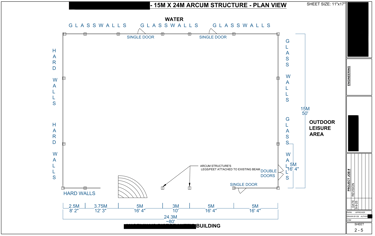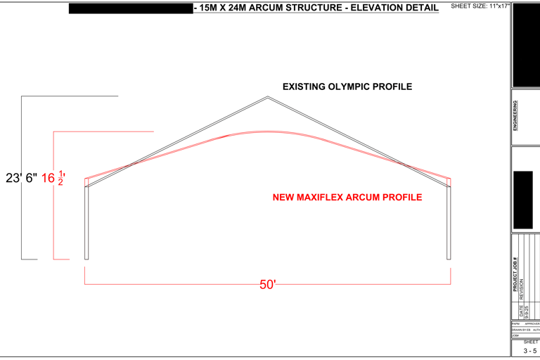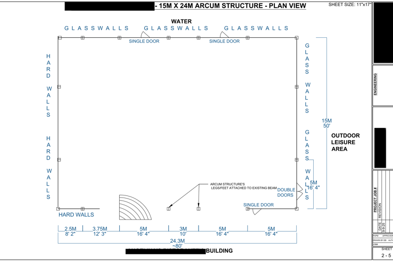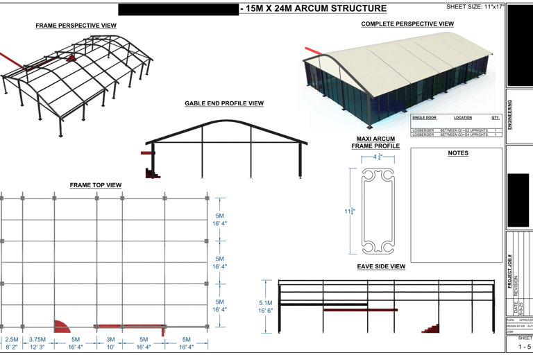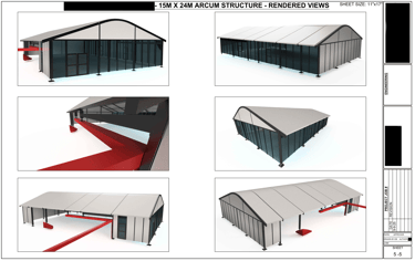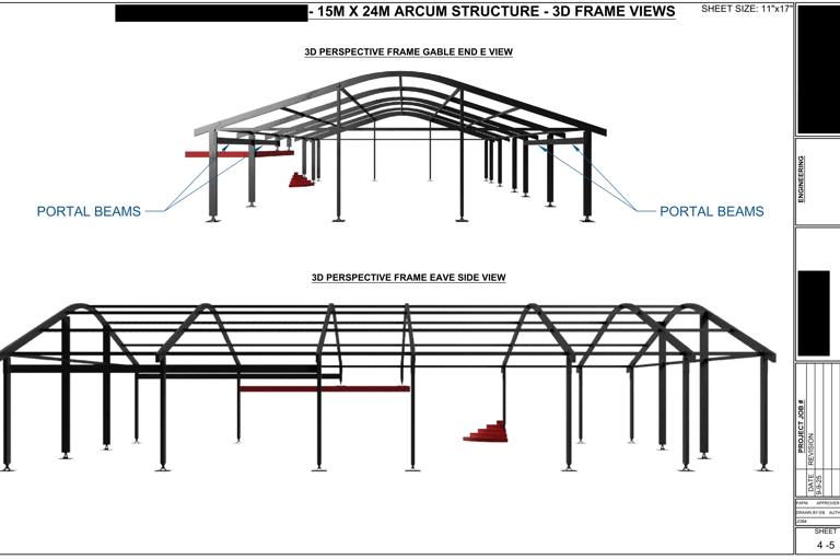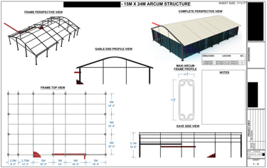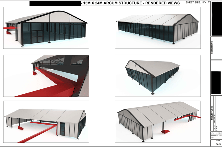 The 5 page drawing (below) was created for a client using Fusion 360 and AutoCAD for layout. It depicts a custom clear-span structure designed to integrate seamlessly with an existing brick-and-mortar restaurant building. The design’s primary purpose was to lower the roof profile relative to the existing structure, thereby enhancing the rooftop dining experience by providing guests with unobstructed, beautiful views over the surrounding area.