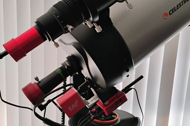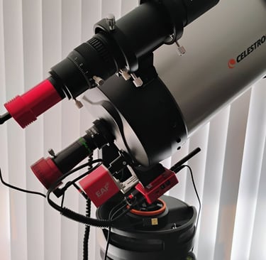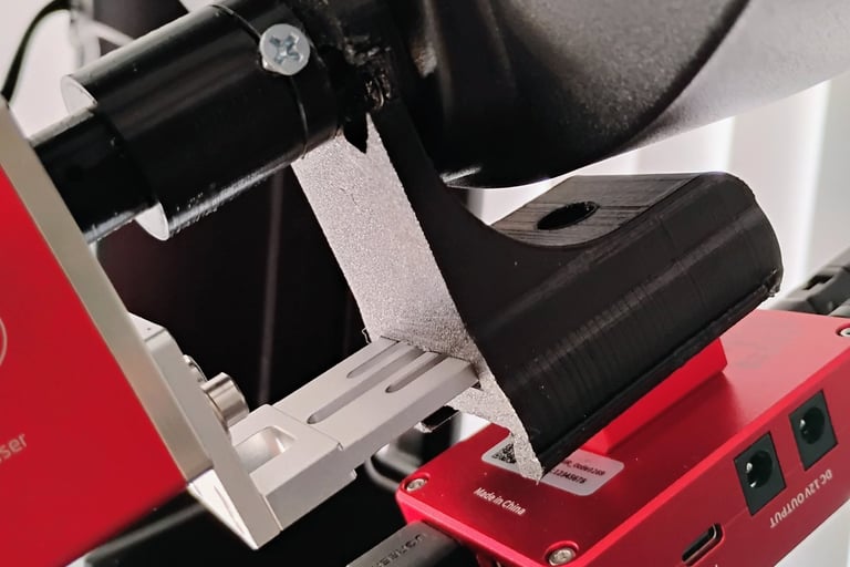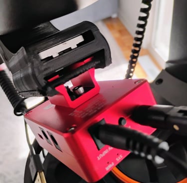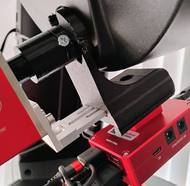 The first image shows the rear section of my astrophotography rig. The red component labeled "EAF" is an electronic automatic focuser that required a custom bracket and coupler to connect two different shaft sizes, while ensuring proper alignment and mounting strength to the scope. I began by designing the coupler (the black cylindrical piece with a silver set screw) and then developed the bracket. This bracket not only securely holds the EAF and coupler in place but also features an integrated dovetail beneath to accommodate a Wi-Fi module. Designing for 3D printing requires solving the functional problem while ensuring the parts can be reliably printed. This project is a prime example of custom 3D modeling and printing used to precisely address a real-world astrophotography challenge.