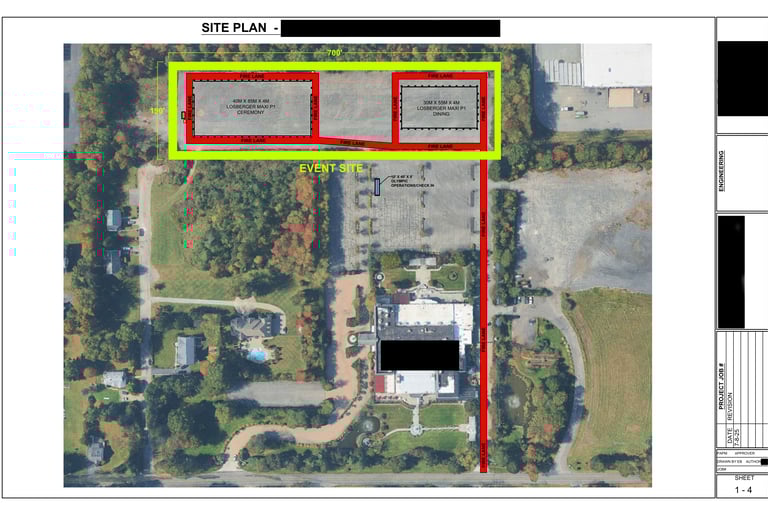 Created in Autocad. Shows several clearspan footprints scaled to satellite view for an event in north Jersey. Sensitive client/job info is redacted.